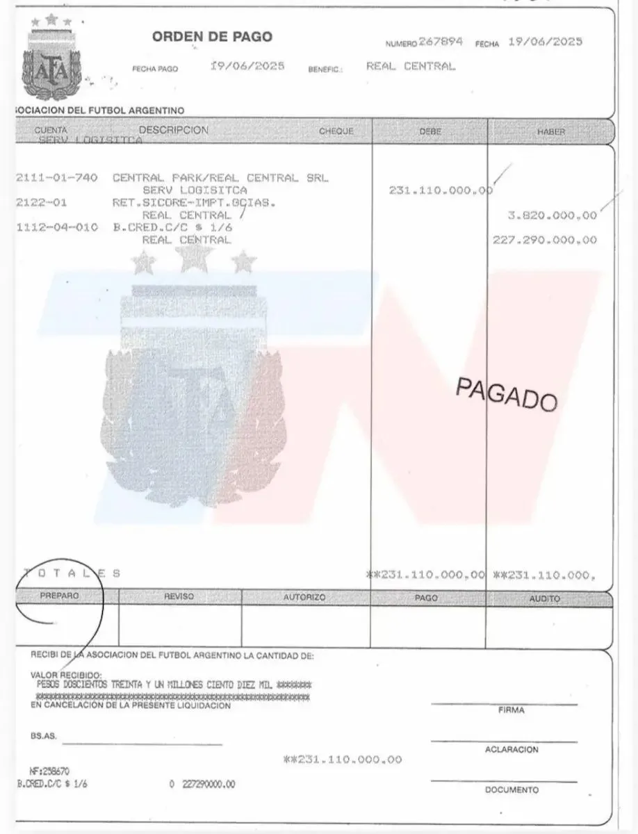 En la segunda orden consta la firma de Luciano Pantano con la leyenda “P/Real Central SRL”, lo que para la investigación confirmaría su rol como representante de la empresa ante la AFA.