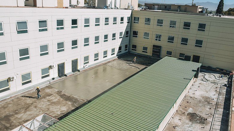 Entre las tareas de relevancia, se desarrolló la impermeabilización total de la azotea, la cual se está llevando a cabo en óptimas condiciones. También se avanza con la remoción de baldosas cerámicas y membrana en mal estado, extracción de aislación termo-acústica de pomeca puzolánica y reparación de bocas de tormenta. Asimismo, se lleva a cabo la ejecución de la carpeta de nivelación y asiento de la impermeabilización, limpieza y aplicación de la malla de refuerzo con membrana líquida.