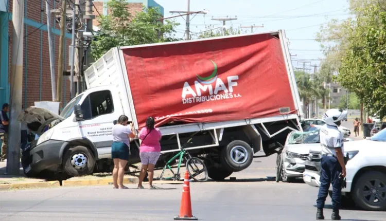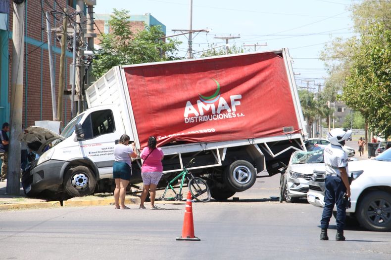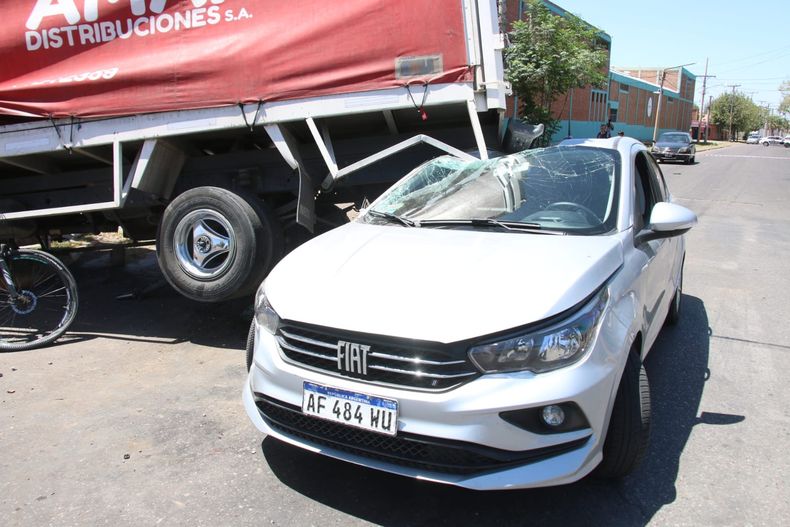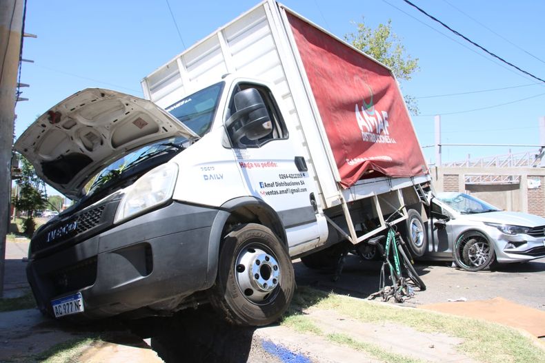 Acorde señalaron fuentes allegadas al siniestro vial, un joven que se trasladaba en bicicleta se vio involucrado en el impacto entre el rodado de mayor porte y un Fiat Cronos. El camión, que se dedica al reparto de mercadería, terminó sobre la esquina de Av. Rawson y Sarassa y parte de su acoplado quedó encima del vehículo más chico.