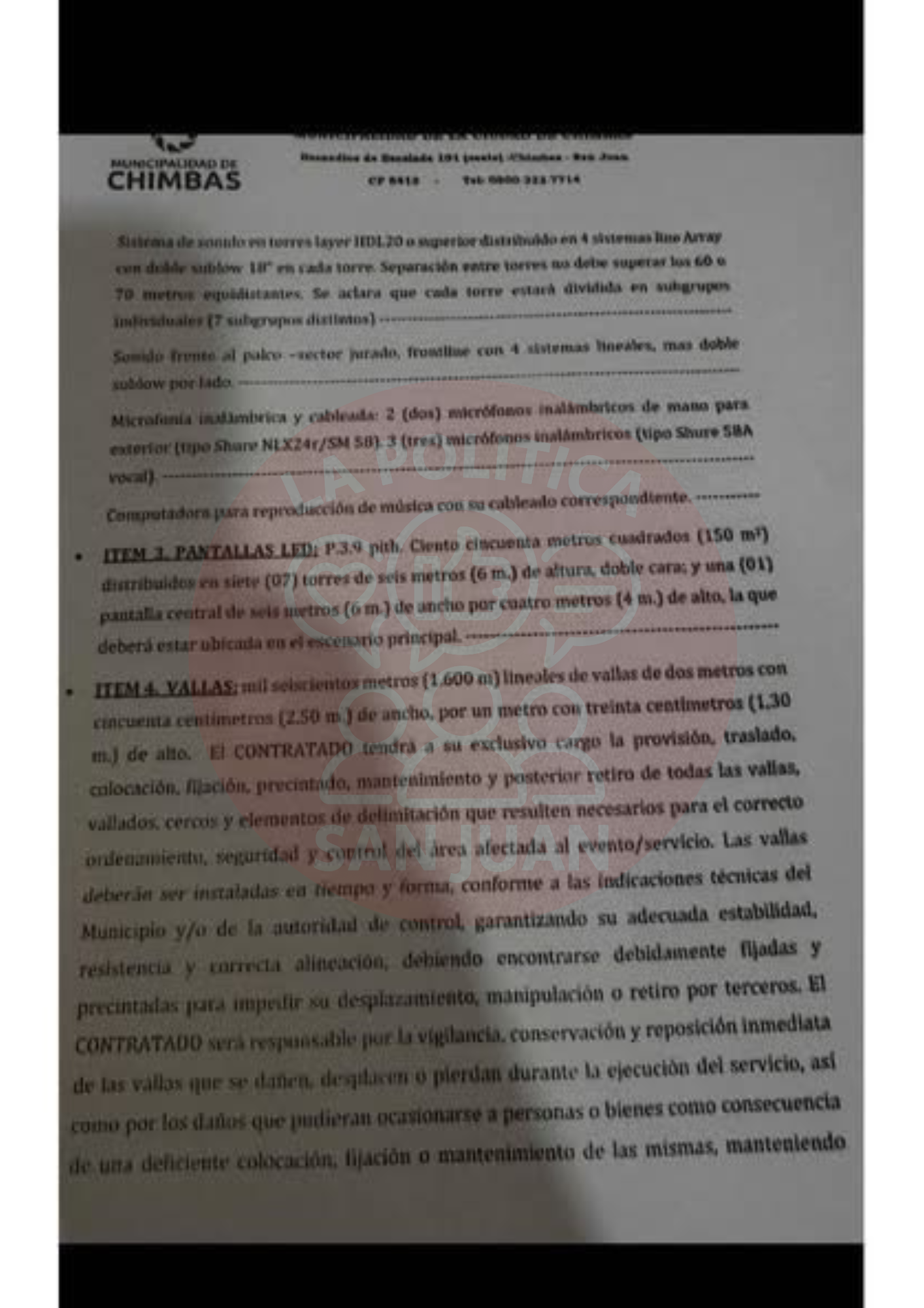 El documento detalla la contratación de una empresa encargada de toda la infraestructura: tribunas para unas 9.000 personas, sistema de sonido a lo largo del predio, pantallas y más de 1.600 metros de vallado, entre otros servicios necesarios para el desarrollo del espectáculo.