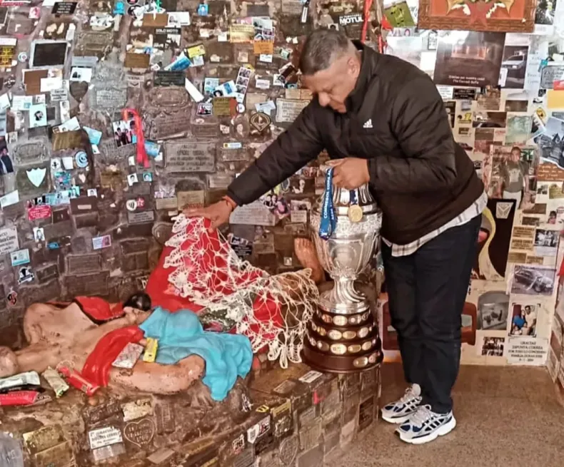 Por cuarta vez, Tapia cumplió su promesa y trajo el trofeo del Bicampeonato, nada más y nada menos. Lo hizo este jueves, sin mucho aviso y de manera privada. Muchos visitantes presentes en la Difunta se encontraron el grato momento y pudieron ser partícipes.