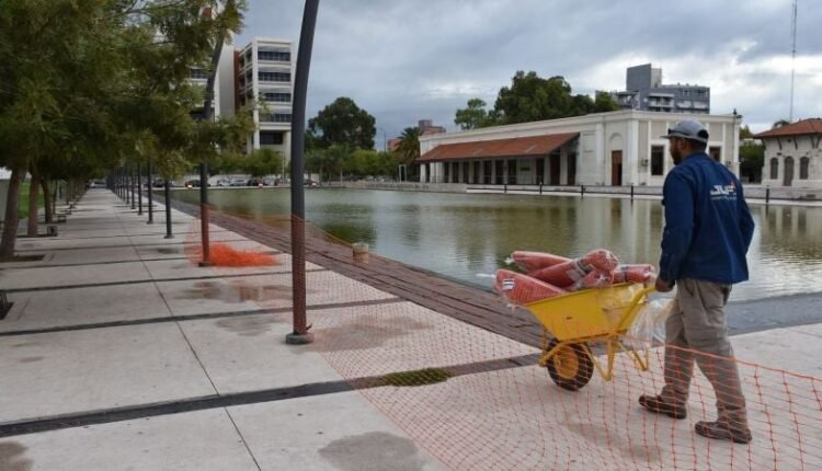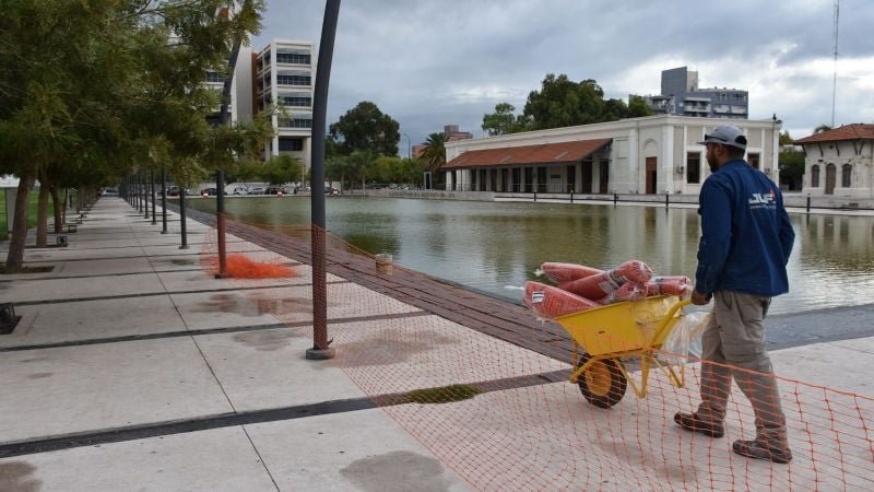 La Subdirección de Espacios Verdes comenzó con las mejoras en la fuente y los jardines de la plaza del Teatro del Bicentenario. Se realizó el vallado de la fuente, para brindar seguridad y durante este fin de semana se procederá al vaciado de la misma.