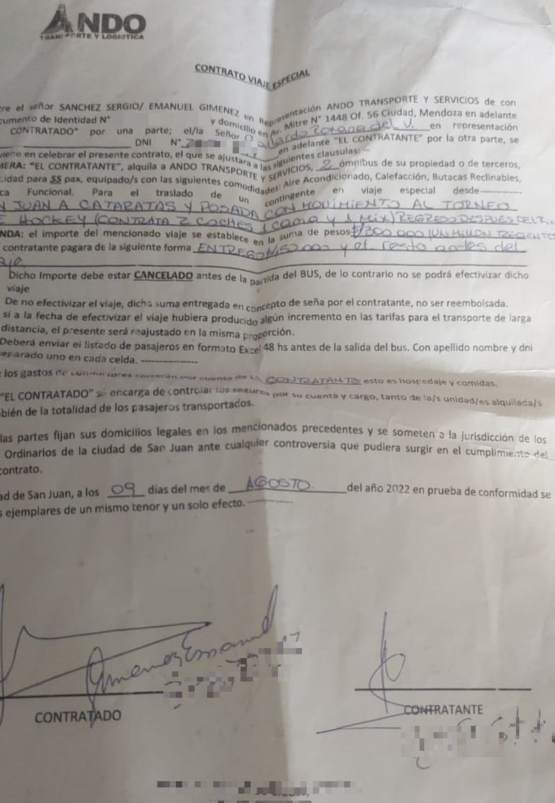 El contingente estaba compuesto por ochenta jugadoras de los clubes Universidad, Estudiantil, AMET y de la municipalidad de Rawson, explicó. Gallardo, que siempre se encarga de organizar esas excursiones, ya había contratado a esta firma para otros viajes. Como en las otras ocasiones, pagaron con antelación: a Giménez le entregaron 1.300.000 pesos y 500 dólares, que cubrían el viaje ida y vuelta de San Juan a Misiones, visita a las cataratas y el traslado diario durante la competencia.