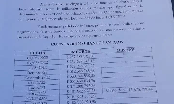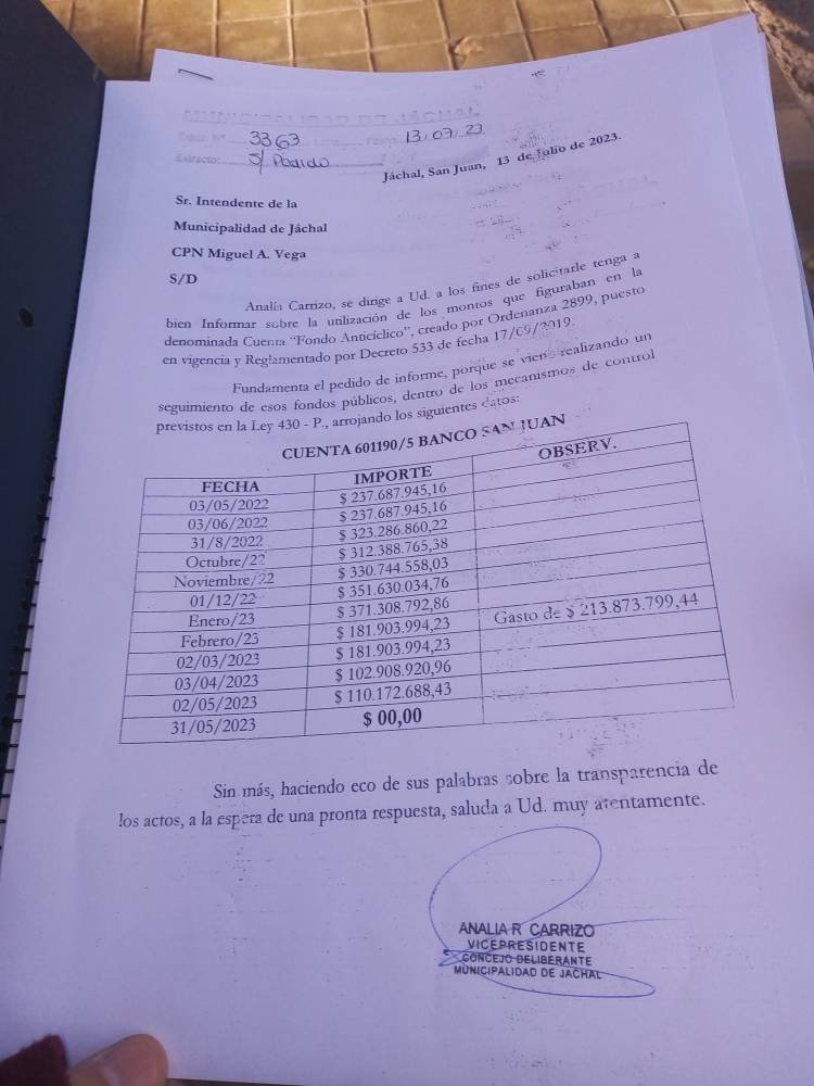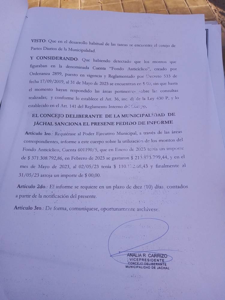 La situación la explicó a un medio, la concejal Analía Carrizo, quien hizo una presentación personal y un pedido de informes en el concejo deliberante jachallero para que se le explique a toda la comunidad el destino que las actuales autoridades municipales le dieron al fideicomiso departamental que existe desde 2019 y que a través de distintos movimientos financieros -para preservar su cantidad- estaba en enero pasado en $ 371.308.792,86.- y luego pasó a “cero pesos” en en el mes de mayo.