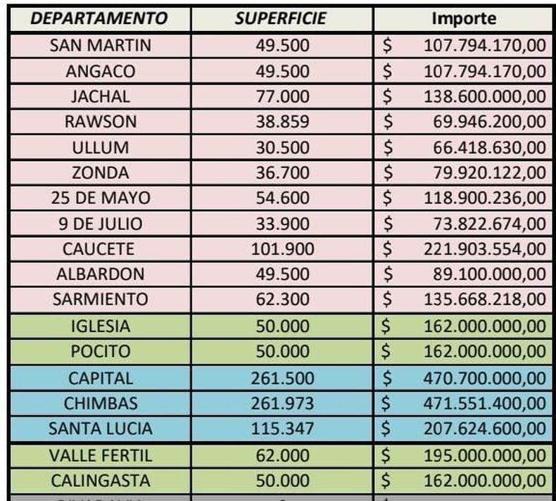 Entre los departamentos que más dinero recibirán están Chimbas con $471.551.400 y Capital con $470.700.000, mientras que los que menos reciben son Ullum con $66.418.630 y Rawson con $69.946.200, según muestra la tabla de distribución oficial.