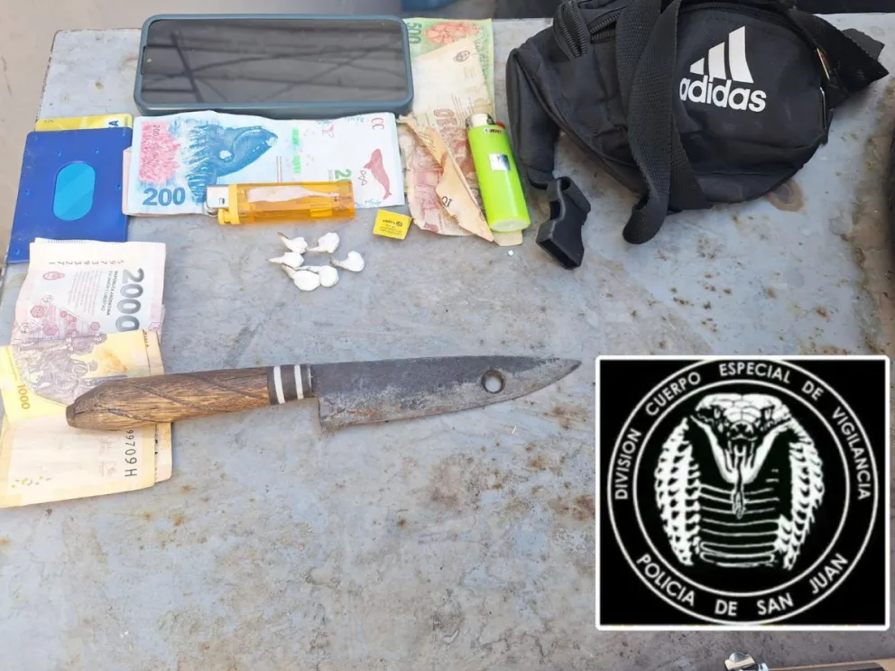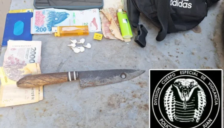 Durante la requisa, los efectivos encontraron entre sus prendas seis bolsas de nailon que contenían una sustancia en polvo de color blanco, la cual posteriormente fue identificada como cocaína. Además, llevaba un cuchillo de acero con mango de madera de aproximadamente 25 centímetros de largo.