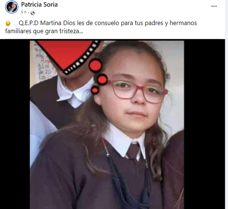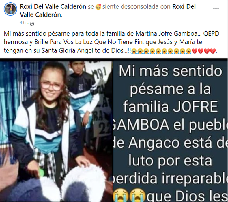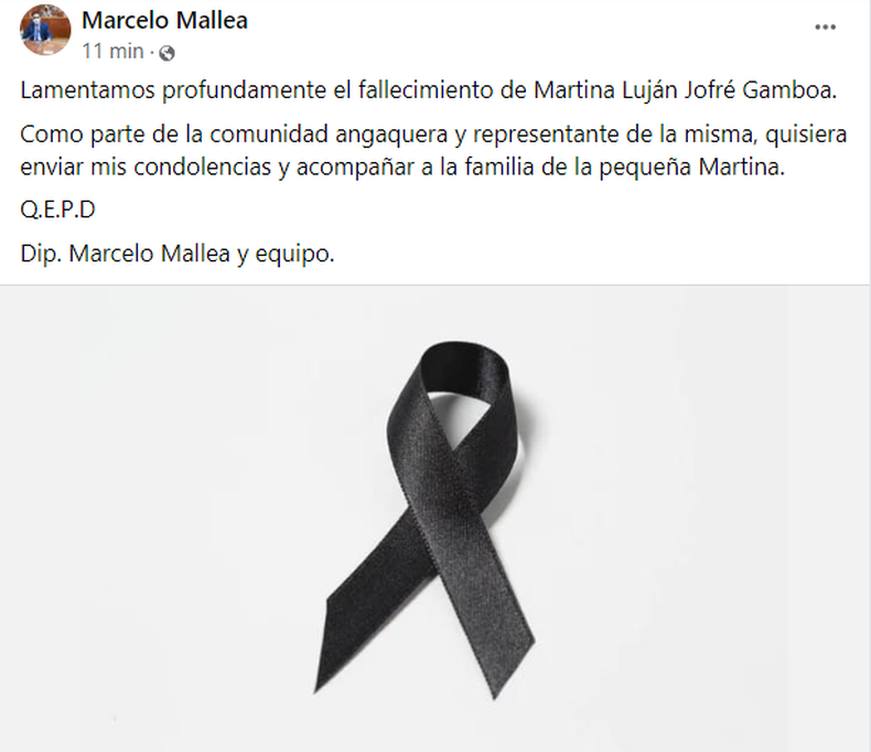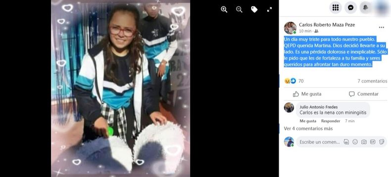 «Un día muy triste para todo nuestro pueblo. QEPD querida Martina. Dios decidió llevarte a su lado. Es una pérdida dolorosa e inexplicable. Solo le pido que les dé fortaleza a tu familia y seres queridos para afrontar tan duro momento», publicó Maza Pezé.