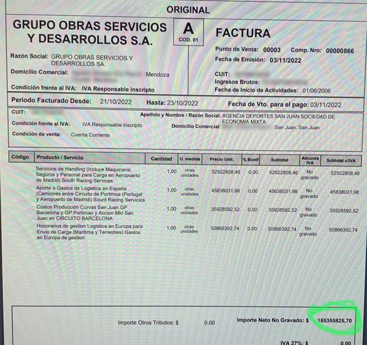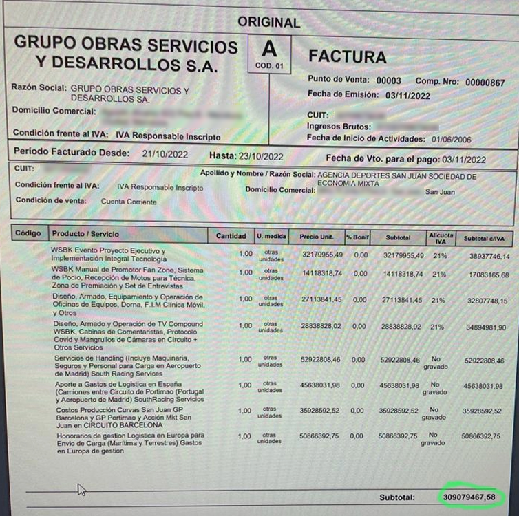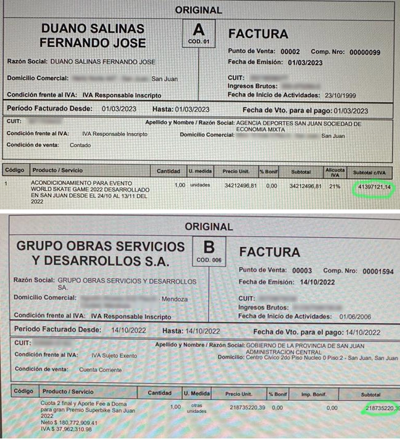 Se conocieron facturas de la empresa Grupo Obras, Servicios y Desarrollo S. A. destinadas a Agencia Deportes San Juan Sociedad de Economía Mixta, con domicilio fiscal en las oficinas de la Secretaría de Deportes del Gobierno de San Juan.
