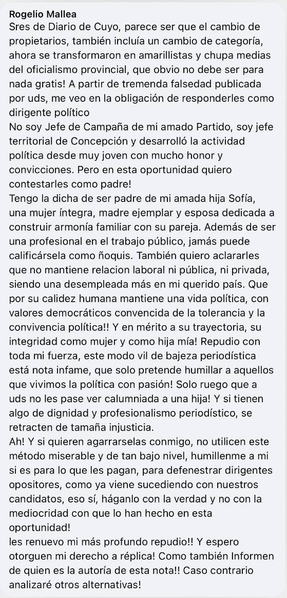 En las últimas horas, Diario de Cuyo publicó una nota en la que señalaba que Sofía Mallea, hija del presidente de la Junta Departamental de Concepción, Rogelio Mallea, había tenido un paso por distintos municipios y recientemente se habría incorporado a la Municipalidad de Rivadavia.