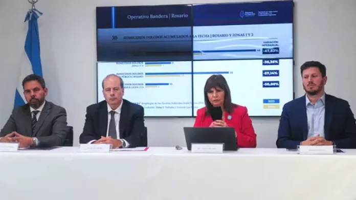 La Ministra de Seguridad, Patricia Bullrich, anunció que bajaron un 57% los crímenes en Rosario con el Plan Bandera y destacó el trabajo en conjunto con el Gobierno de Santa Fe y el intendente de la ciudad.