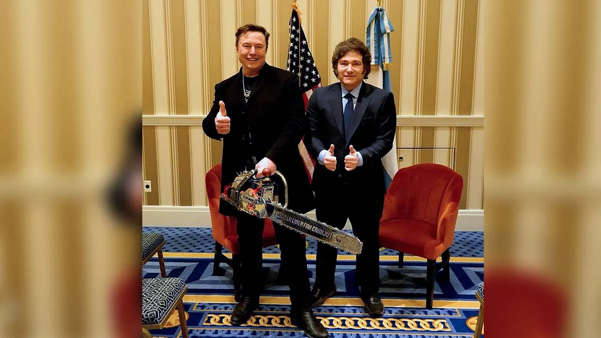 Según informó un comunicado de la Oficina del Presidente, “Javier Milei se reunió en Estados Unidos con el empresario y Director del Departamento de Eficiencia Gubernamental, Elon Musk, a quien le regaló una réplica de la motosierra que tiene en su despacho“.