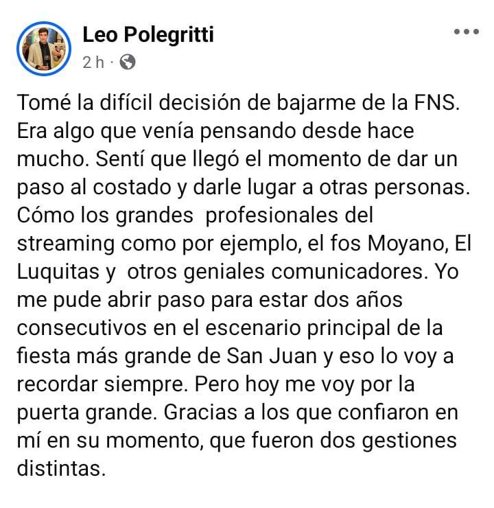Aunque sus palabras fueron claras y con tono de despedida, algunos seguidores se preguntaron si esa será la única razón detrás de su decisión. Por ahora, Polegritti se mostró agradecido con la organización y con el público que lo acompañó en las últimas ediciones de la FNS.