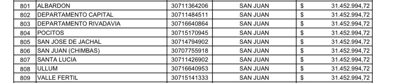 Según el listado anexo, en San Juan son 9 los cuarteles que recibirán ésta cifra millonaria, entre los que se encuentran: Albardón, Capital, Rivadavia, Pocito, Jachal, Chimbas, Santa Lucia, Ullum y Valle Fertil.