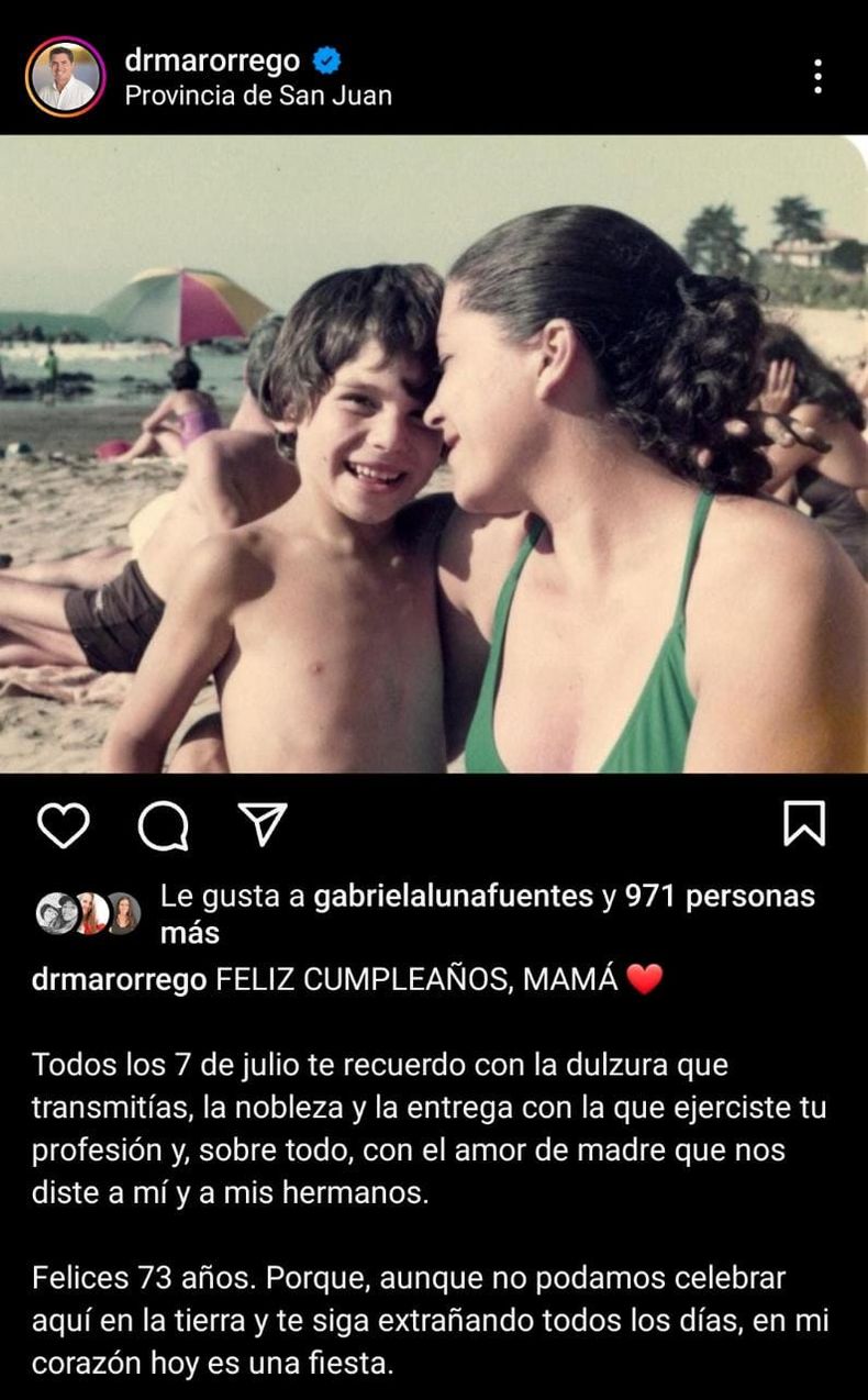 A menos de una semana de haber sido elegido como gobernador en San Juan, Marcelo Orrego se mostró emotivo a través de las redes sociales, donde posteó una foto del pasado y recordó a una persona muy especial en su vida: a su mamá.