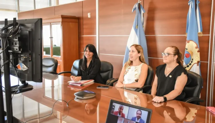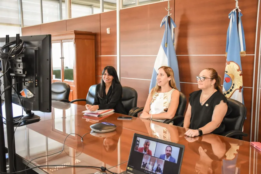 La ministra de Gobierno Laura Palma junto con la secretaria de Relaciones Institucionales, Claudia Sarmiento, y la directora de Integración Municipal de Vicuña, Chile, Vanina Villegas, mantuvieron una videoconferencia con el alcalde de Vicuña, Rafael Vera Castillo y el director de Relaciones Internacionales, Emilio Reyes.