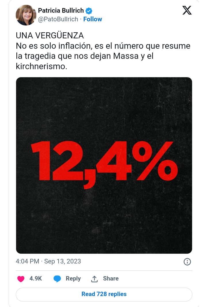 La candidata presidencial de Juntos por el Cambio, Patricia Bullrich, aseguró que el dato inflacionario es una «vergüenza» y agregó: «No es solo inflación, es el número que resume la tragedia que nos dejan Massa y el kirchnerismo».