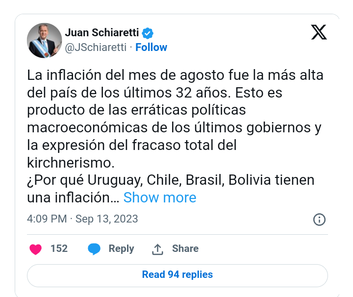 Por su parte, el gobernador de Córdoba y aspirante a la Presidencia por Hacemos por Nuestro País, Juan Schiaretti, señaló: «Esto es producto de las erráticas políticas macroeconómicas de los últimos gobiernos y la expresión del fracaso total del kirchnerismo».