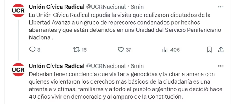 “Deberían tener conciencia que visitar a genocidas y la charla amena con quienes violentaron los derechos más básicos de la ciudadanía es una afrenta a víctimas, familiares y a todo el pueblo argentino que decidió hace 40 años vivir en democracia y al amparo de la Constitución”, publicó la UCR en su cuenta de X.