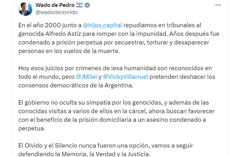 Desde la oposición también criticaron a los diputados libertarios que visitaron el penal de Ezeiza. “El gobierno no oculta su simpatía por los genocidas, y además de las conocidas visitas a varios de ellos en la cárcel, ahora buscan favorecer con el beneficio de la prisión domiciliaria a un asesino condenado a perpetua”, publicó el diputado de UxP Eduardo “Wado” de Pedro, hijo de desaparecidos.