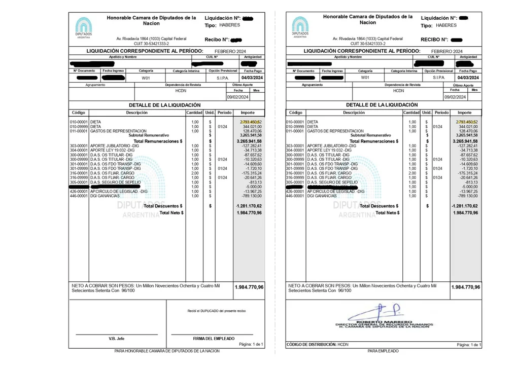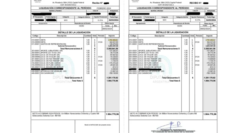 Los diputados nacionales ya perciben casi dos millones de pesos en mano según el último recibo de sueldo.