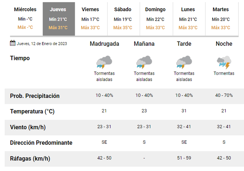 Según el SMN, se esperan tormentas aisladas para toda la jornada y viento del sector Sureste. La mínima pronosticada es de 21° y la máxima de 31° para todo el territorio sanjuanino,.