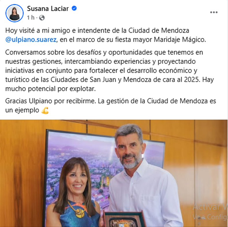 La jefa comunal viajó en el marco de la fiesta mayor de Maridaje Mágico, que se celebra en la provincia vecina. A través de sus redes sociales, Laciar compartió imágenes de la reunión con Suárez y aseguró que se trató de conversar sobre «los desafíos y oportunidades que tenemos en nuestras gestiones, intercambiando experiencias y proyectando iniciativas en conjunto».