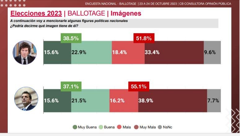 El libertario Javier Milei, es quien tiene mejor imagen positiva y menor imagen negativa, considerando la sumatoria de Muy Buena (15.6%) y Buena de (22.9%), obteniendo un total positivo de 38.5% mientras que en la cuenta de Mala (18.4% ) y Muy Mala (33.4%) arroja un total de 51.8%, siendo un 9.6% de personas que no saben o no contestan.