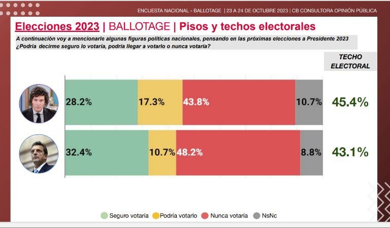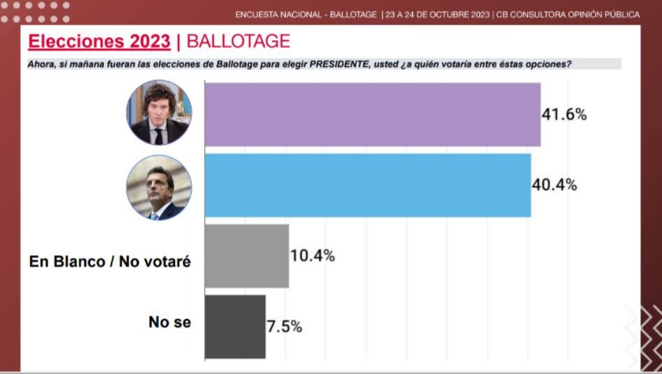 La encuesta realizada por CB Consultora de Opinión Pública, arroja que quien se pondría la banda presidencial y tomaría el bastón de mando, es el libertario Javier Milei con un total de 41.6%, mientras que Sergio Massa alcanzaría un 40.4%.