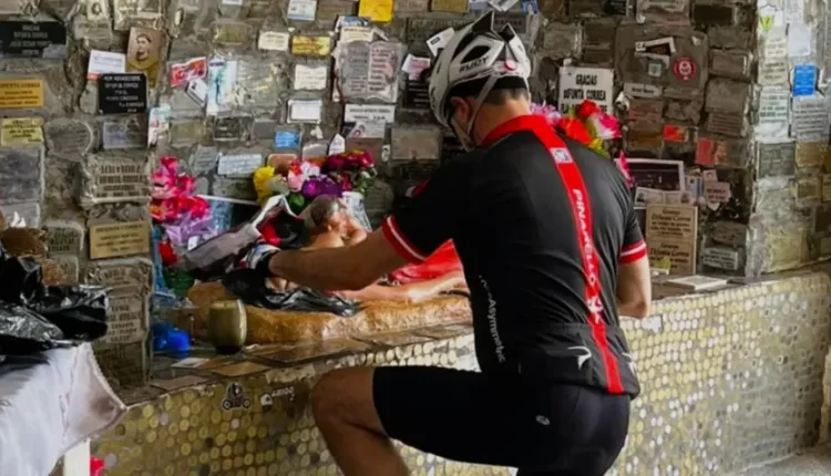 El mandatario estuvo lejos de su atuendo diario, aunque cerca de su pasión por el ciclismo. Vestido con calza deportiva y ropa ciclística, el gobernador se arrodilló ante la imagen de Deolinda Correa y le agradeció.