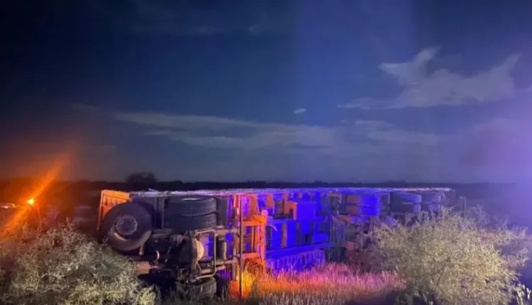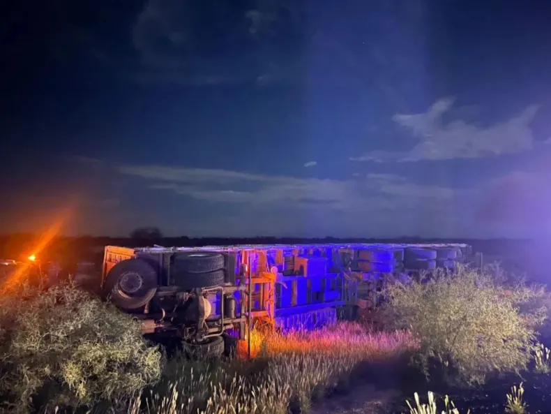 Un camión con semirremolque volcó durante la madrugada al costado de la Ruta Nacional 20, en el departamento 25 de Mayo, luego de perder estabilidad mientras circulaba por la zona.