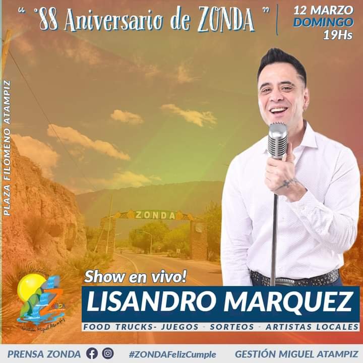 Este domingo a partir de las 19:30 horas, en la Plaza Filomeno Atampiz, la Municipalidad de Zonda, celebra su 88° aniversario de la mejor forma; con entrada libre y gratuita.